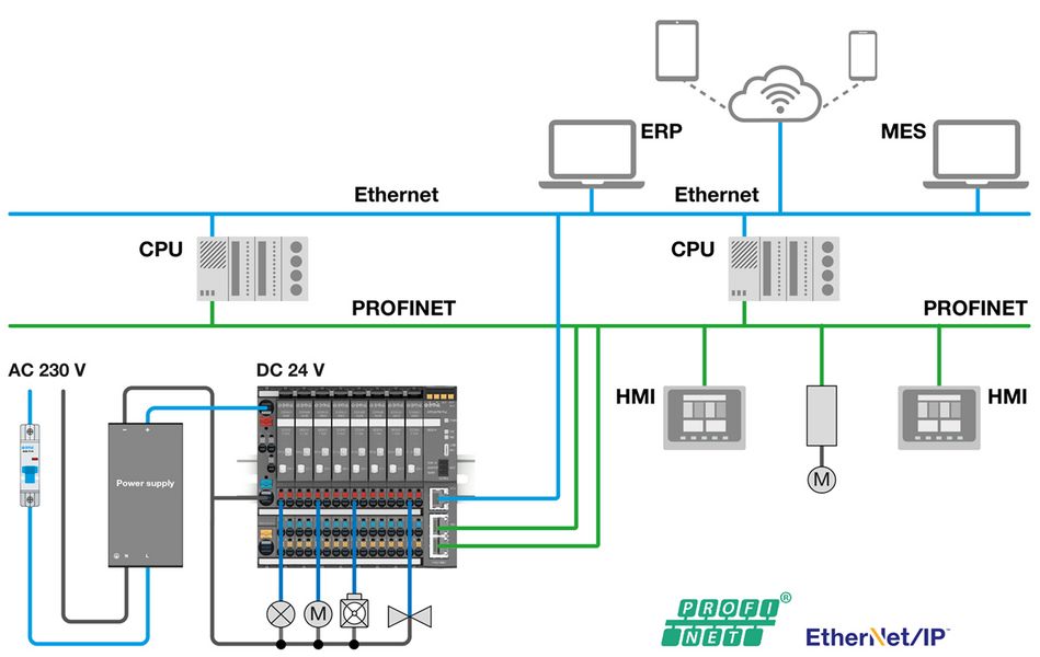 Der Buscontroller CPC20 ist das Gehirn des gesamten Systems. Er bietet mit seinen Schnittstellen eine perfekte Anbindung an die übergeordneten Systeme. Auf der Feldebene verbindet er das Stromverteilungssystem mit seinen Schnittstellen für PROFINET und EtherNet/IP mit der den angeschlossenen CPU’s sowie HMI’s und ermöglicht dadurch den notwendigen Datenaustausch. Somit werden die Messwerte und Statusinformation für den Anlagenbediener sowie dem Wartungspersonal visualisiert.