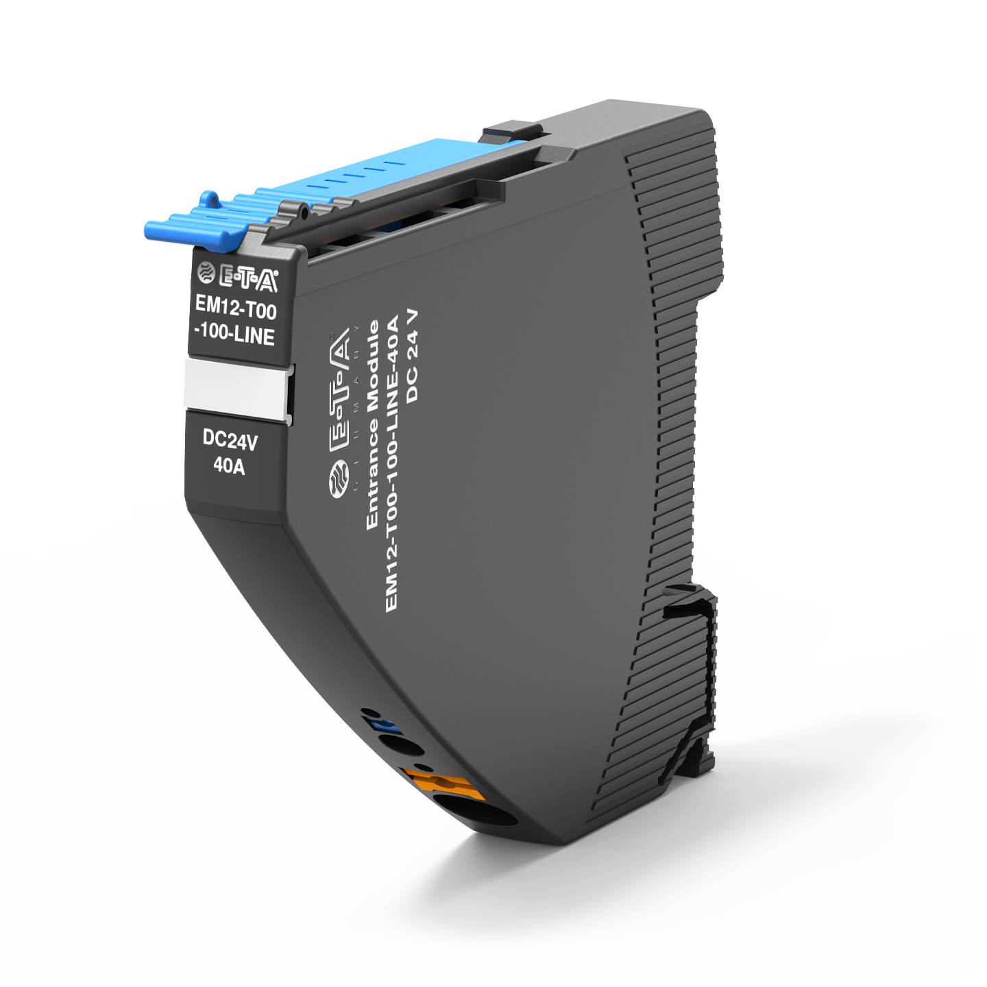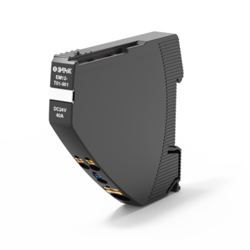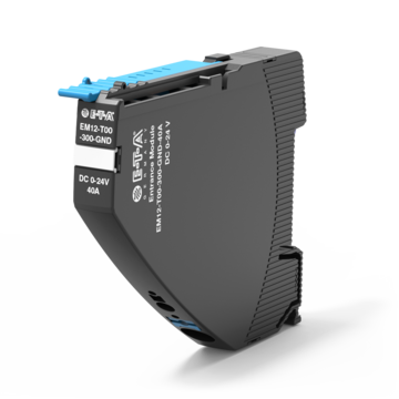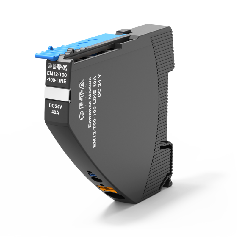 Das Einspeisemodul EM12-T nimmt die DC 24 V / DC 48 V Versorgungsspannung z. B. von einem getakteten Schaltnetzteil auf und verteilt diese über den integrierten Kontakthebel an die angereihten REX12-T / REX12D-T / REX22D-T Sicherungsautomaten.